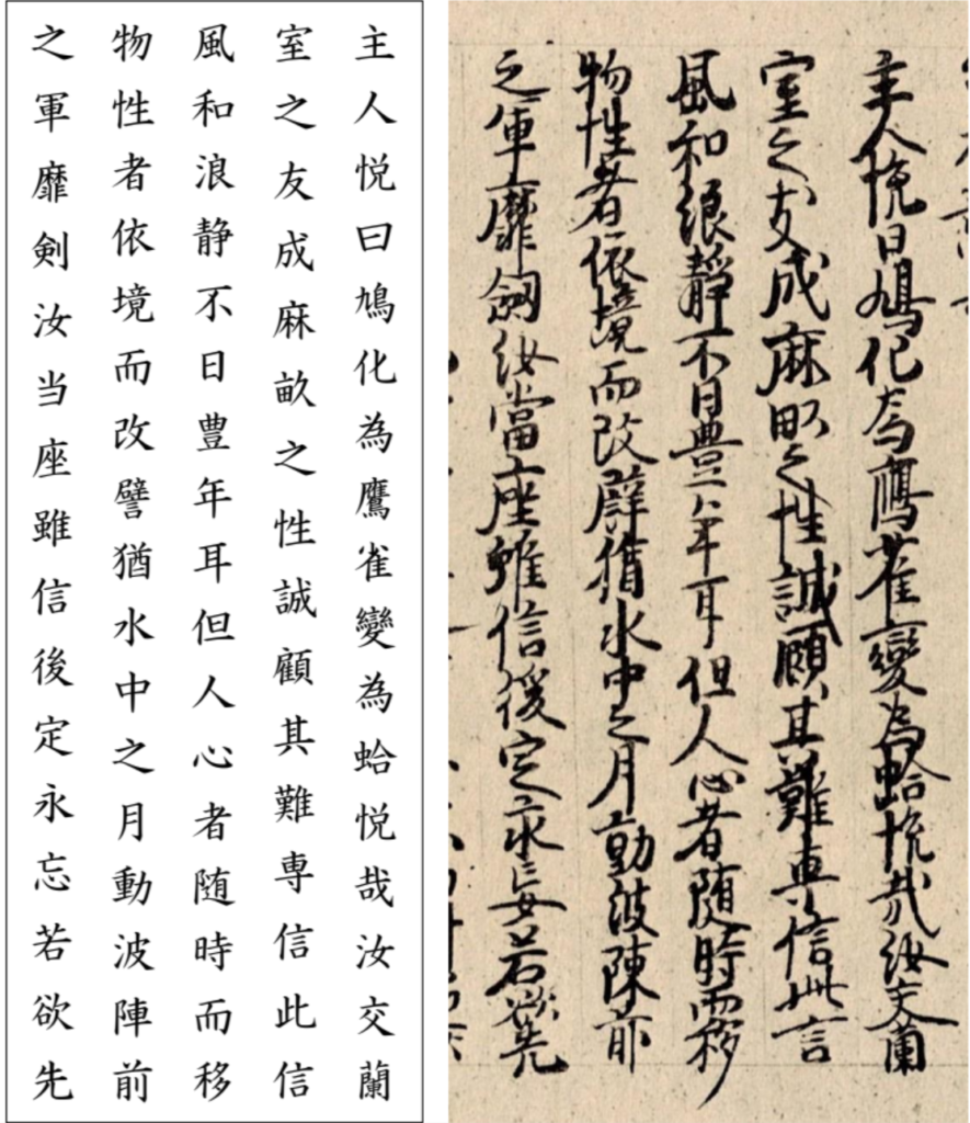 主人悦 (よろこ)んで日く、鳩 (はと) 化 (け) して鷹 (たか) と為り、雀 (すずめ) 変 (へん) じて蛤 (はまぐり) と為る。悦ばしいかな、汝蘭室 (らんしつ) の友に交はりて麻畝 (まほ) の性 (しょう) と成る。