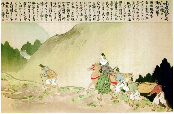 大聖人様に奉る御供養の品々を携え、家臣と共に参詣する時光