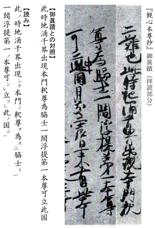 〈本門の教主釈尊を脇士と為す〉と読めば、地涌千界が中心となり本門の教主釈尊が脇士となります。